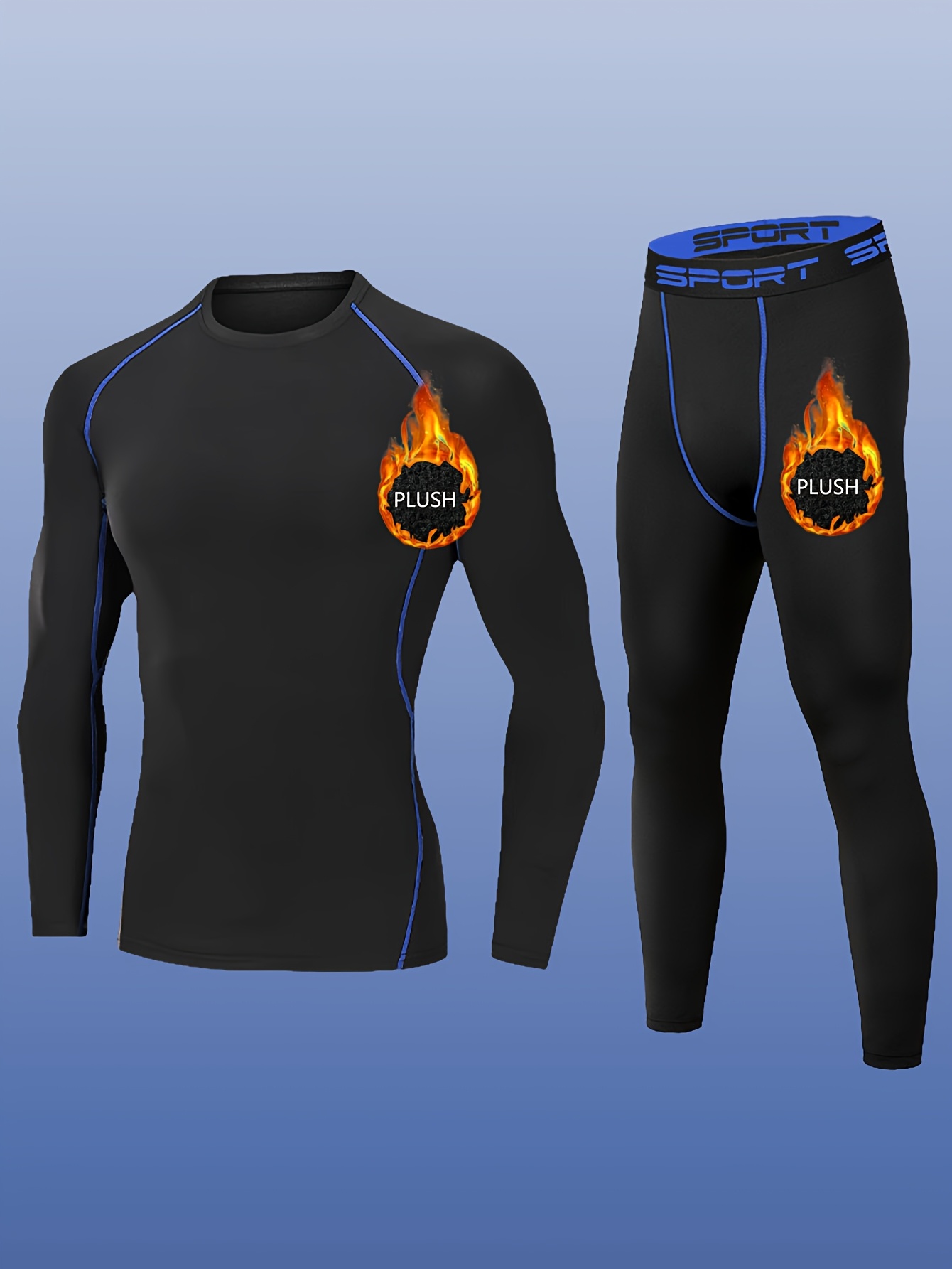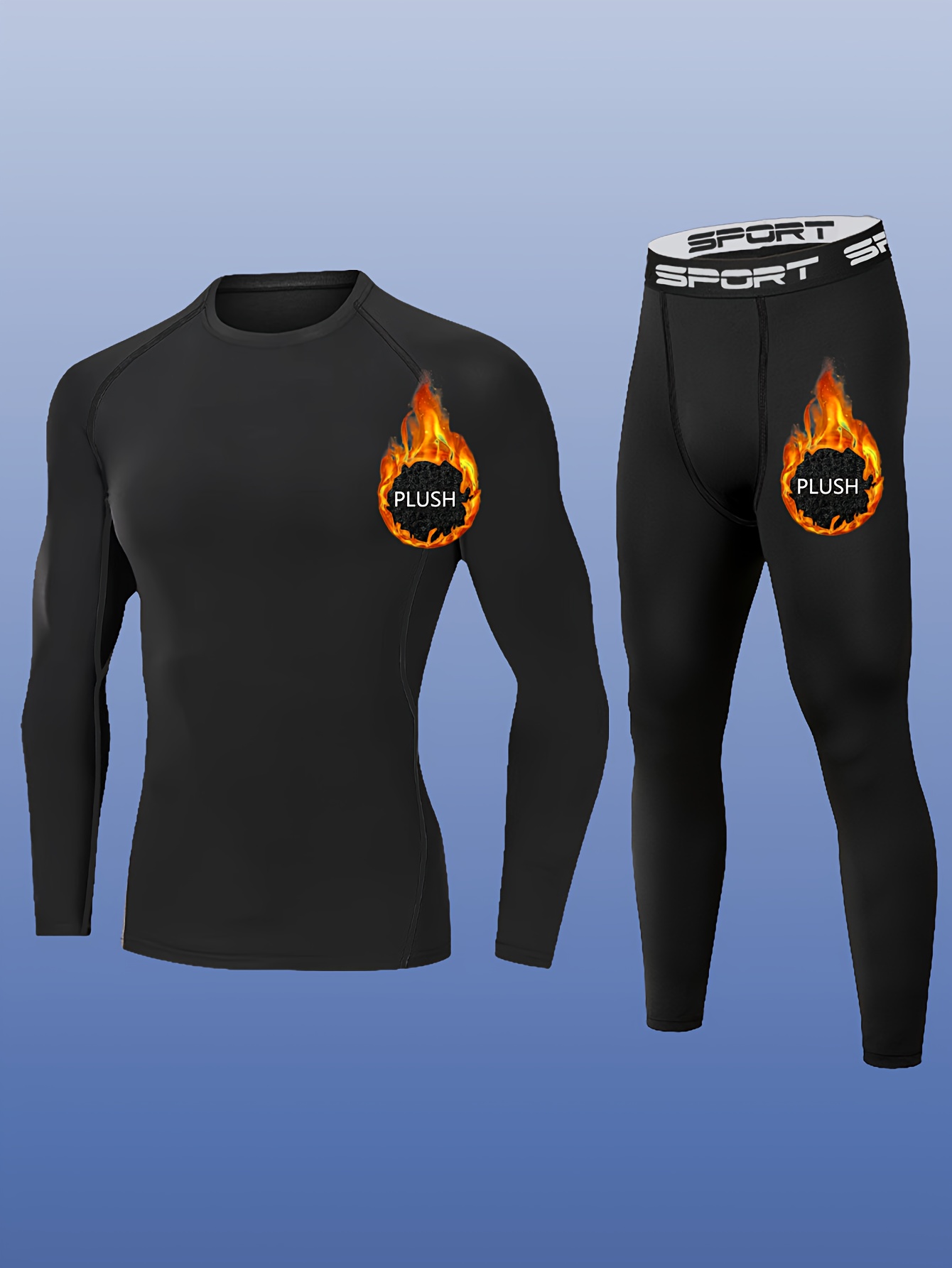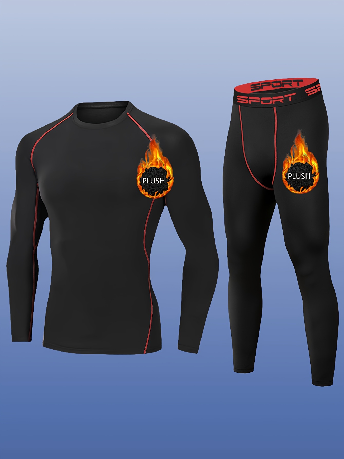 2pcs Men'S Plush Sport Compression Shirt & Leggings Set - Quick-Dry, High-Elasticity, Breathable Athletic Underwear for Running & Outdoor Activities, Black with Pink Accents, Autumn Winter Workout Gear, Workout Clothes, Autum